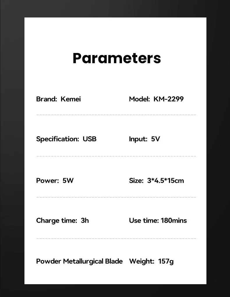 Kemei KM-2299 er en profesjonell hårklipper utviklet for menn som ønsker presis og jevn klipping med maksimal komfort. Den kombinerer kraftig ytelse, moderne design og praktisk USB-lading for en sømløs klippeopplevelse – perfekt for både hjemmebruk og profesjonell styling.