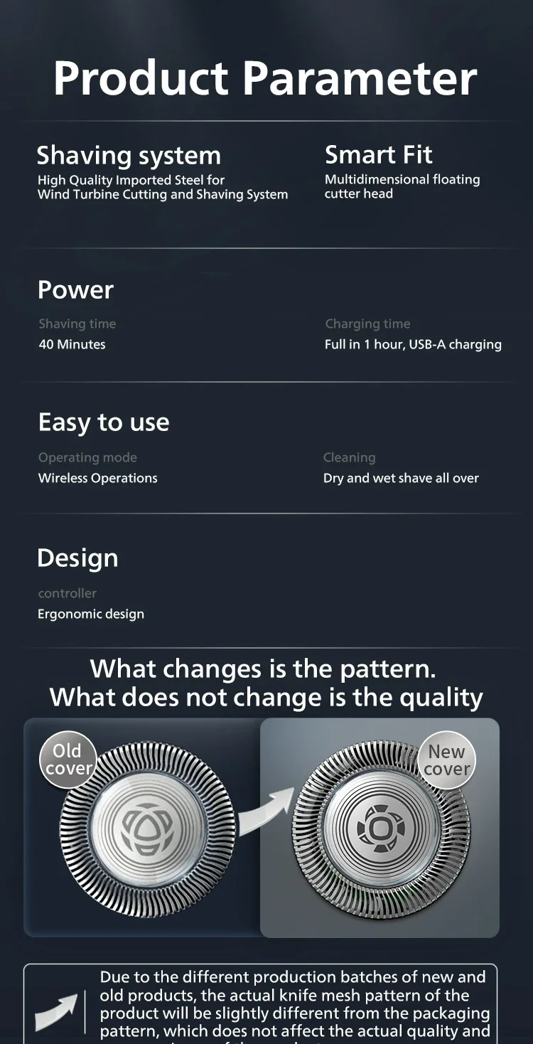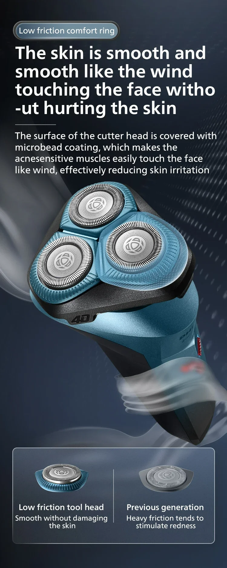 Den innovative Low Friction Ring-teknologien reduserer friksjon mot huden, noe som gjør maskinen spesielt godt egnet for sensitiv og akneutsatt hud. I tillegg bidrar det syklonbaserte skjæresystemet til å fjerne hår effektivt uten gjentatte drag. Maskinen er IPX7-klassifisert, som betyr at den kan brukes både til våt og tørr barbering, og hele enheten kan skylles under rennende vann.