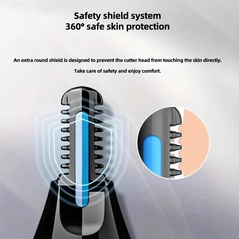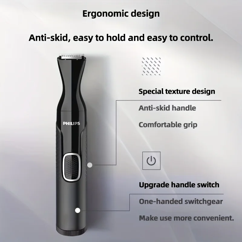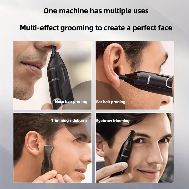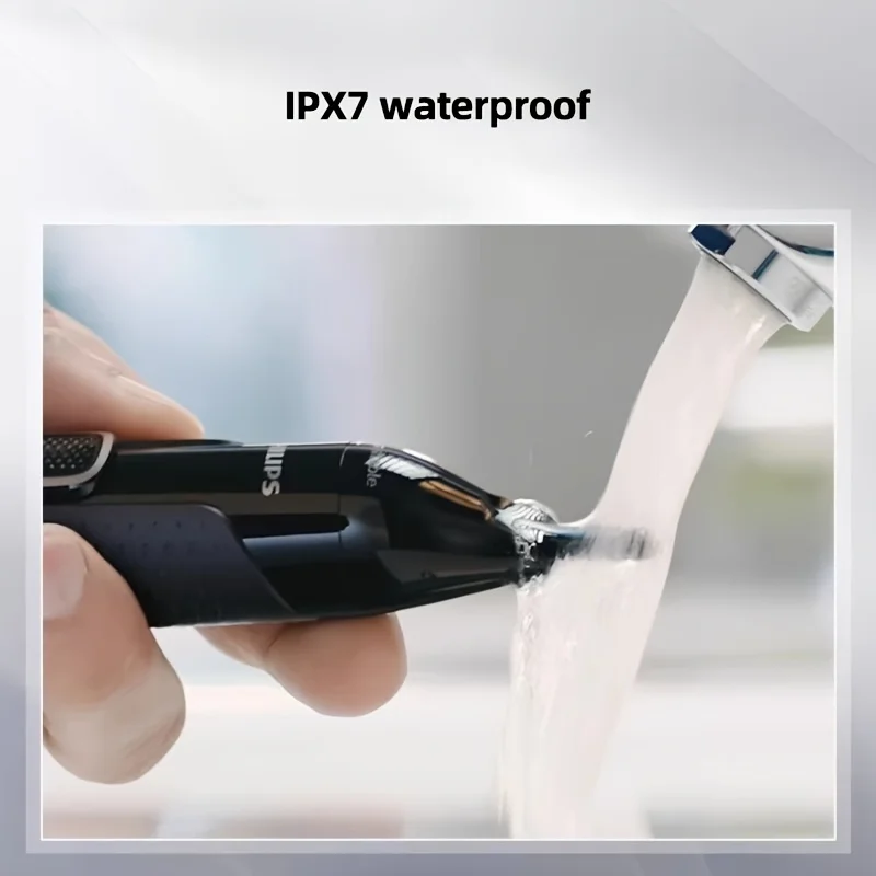 Trimmeren har et unikt vinkelhode som gjør det enkelt å nå selv vanskelige områder, og den kan brukes til både nese, ører, kinnskjegg og detaljer rundt skjegg og bart. Den er 100 % vanntett (IPX7), slik at du trygt kan skylle hele enheten under rennende vann etter bruk.