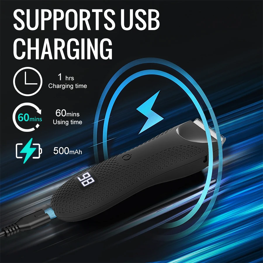 Med opptil 90 minutters brukstid etter kun 2 timers lading, får du kraftig ytelse og fleksibilitet. Trimmeren kan brukes både trådløst og med ledning, og det vanntette designet gjør den enkel å rengjøre under rennende vann. Perfekt for deg som vil holde kroppen velstelt – fra topp til tå.