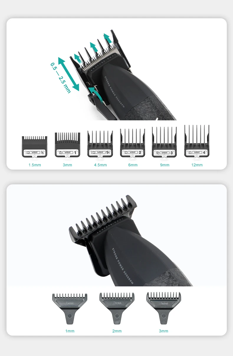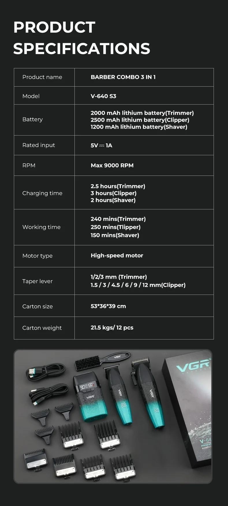 Opplev kraft, presisjon og luksus i ett med VGR V-640 S3, et komplett 3-i-1-groomingsett som kombinerer klipper, trimmer og barbermaskin i profesjonell kvalitet. Med en kraftig 9000 RPM høyhastighetsmotor og DLC-belagte (Diamond-Like Carbon) blader får du presis klipp uten draing – perfekt for fading, skjeggforming eller helbarbering.